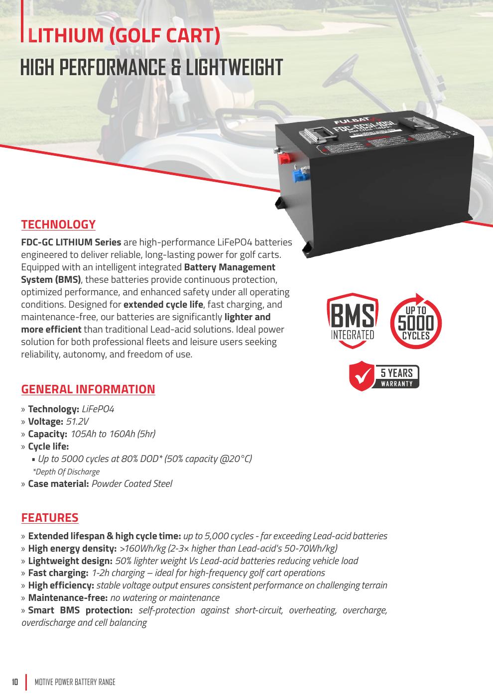 FDC Deep Cycle Lithium Series are Lithium iron phosphate (LiFePO4) batteries that offer exceptional performance – longer life, fast charging and high reliability for a wide range of applications such as Golf Cart, Utility vehicle, AGVs…